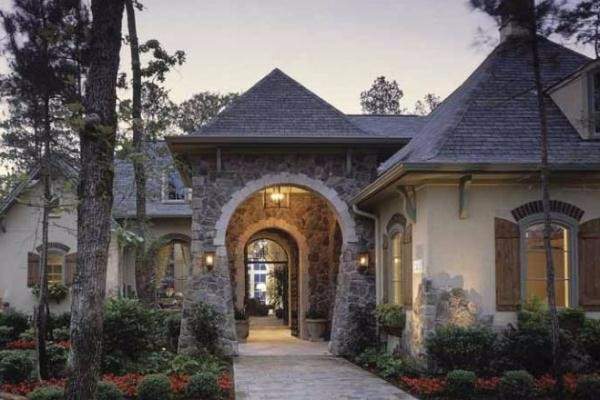 В домах, выполненных в тюдорском стиле, наличие крыльца не принято, вместо него сооружают небольшой навес, который украшают вьющейся растительностью.