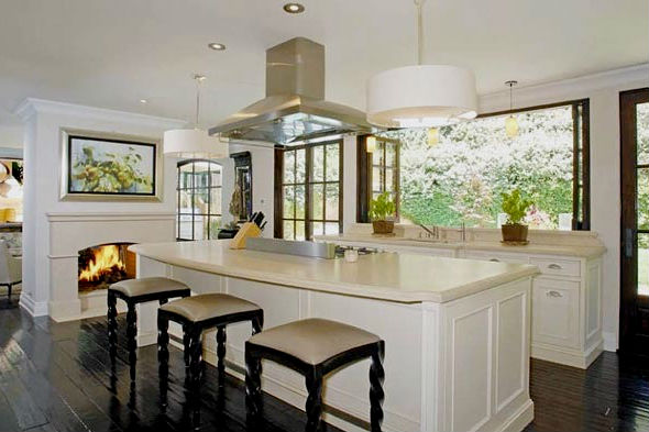На кухне также как и в других комнатах преобладает белый цвет, здесь присутствует двусторонний камин, обратная его часть смотрит на гостиную для своих.