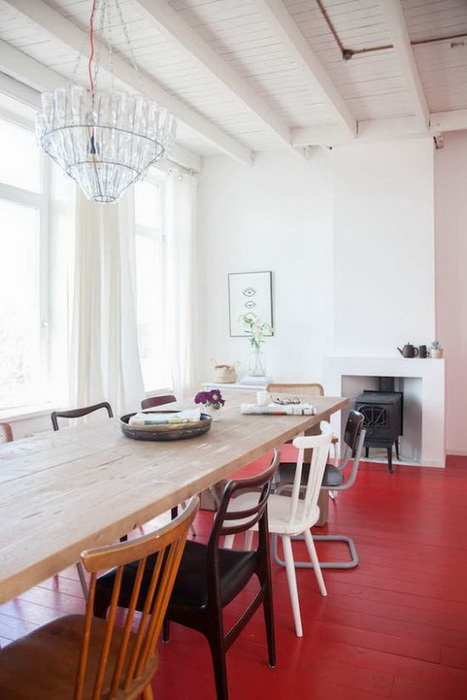 Дизайнеры красят пол довольно часто, придавая ему особые эффекты. Не бойтесь насыщенных тонов краски! Они придадут сочности и акцентируют внимание на стоящей мебели и аксессуарах.