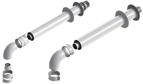 • Камеры сгорания закрытого типа (турбированные котлы). Они работают в паре с дымоходами коаксиального типа — из двух вставленных друг в друга труб. По одной трубе отводятся продукты сгорания, по другое поступает воздух для поддержания горения. Коаксиальная труба обычно выводится через стену на улицу. Потому говорят, что подобные газовые котлы не имеют дымохода. Но, при желании, вывести дымовую трубу можно и в атмосферный дымоход. В этом случае нужна нормальная тяга (при выводе в стену это неважно, так как движение газов обеспечивает турбина).