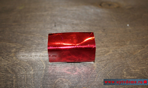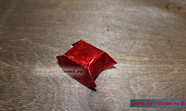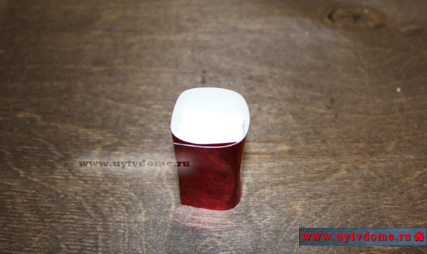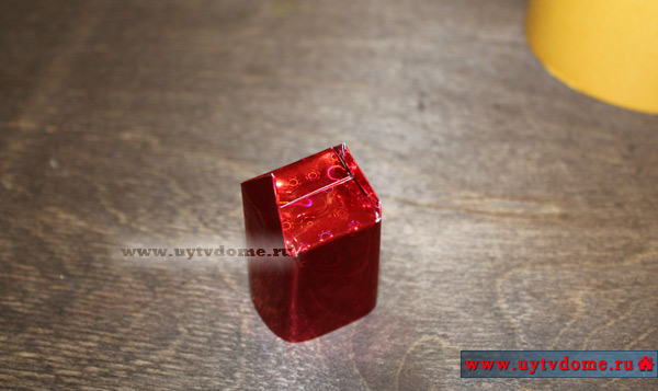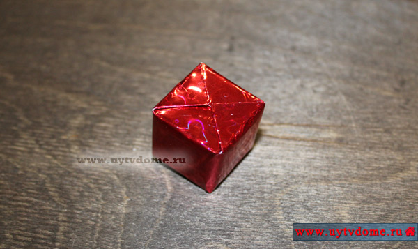 Получается изделие с торчащими острыми кончиками упаковки. На каждый из них с внутренней стороны нужно приклеить по небольшому отрезку двустороннего скотча. И плотно прижать к кубику.