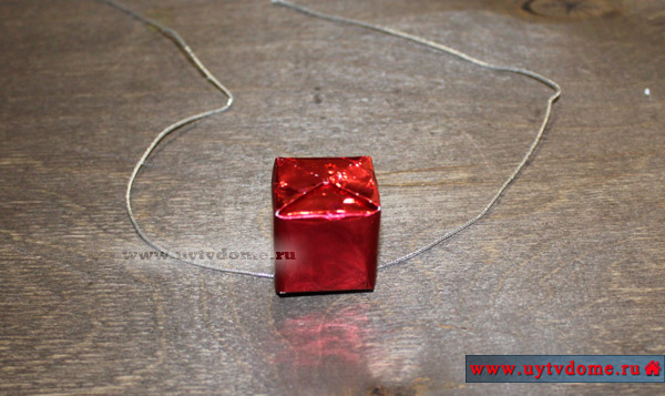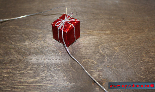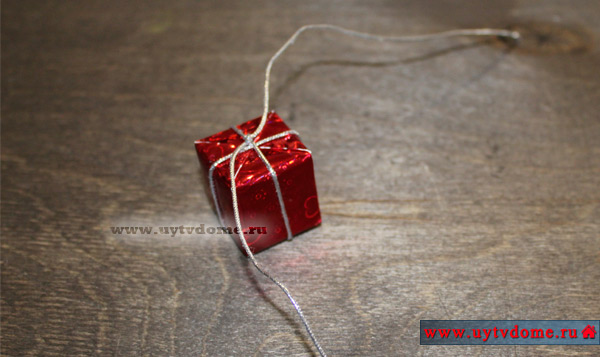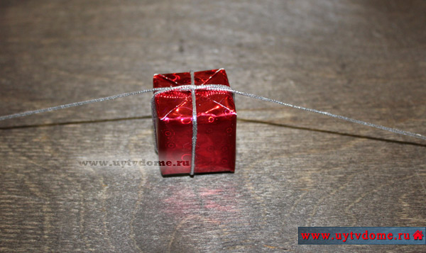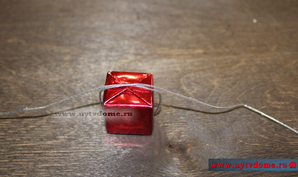 Берем декоративный шнур, длиной примерно 30 см. Укладываем его под упакованным кубиком, поднимаем концы шнура к верху, перекрещиваем между собой и проводим их по противоположным боковым стенкам «подарка». Переворачиваем подарочек и завязываем сверху узелок.