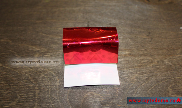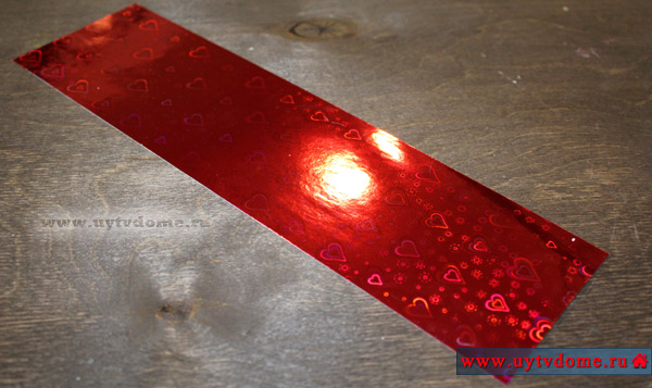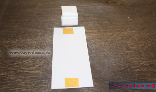 Вырезаем заготовку из бумаги. Сверху и снизу наклеиваем небольшие отрезки двустороннего скотча.