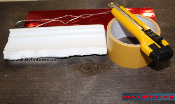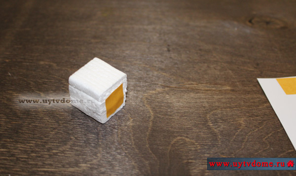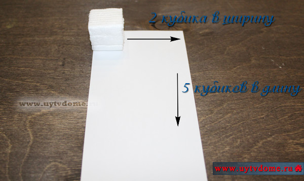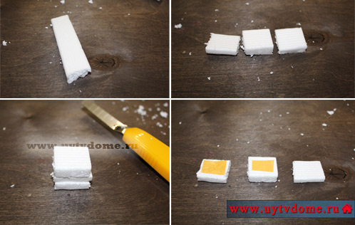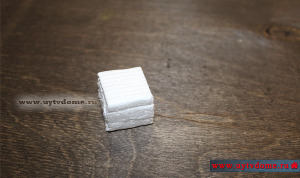 Если у Вас есть толстый пласт пенопласта, то просто из него вырежьте канцелярским ножом кубик нужно размера, оптимальный размер 1,5*1,5 см. Если такого толстого пенопласта нет, то можно пойти следующим путем: из ненужных пенопластовых плинтусов вырезать пласты нужного размера, а затем все их склеить вместе при помощи двустороннего скотча, а неровные края подрезать канцелярским ножом. Ниже можете посмотреть, как мы решили данный вопрос.