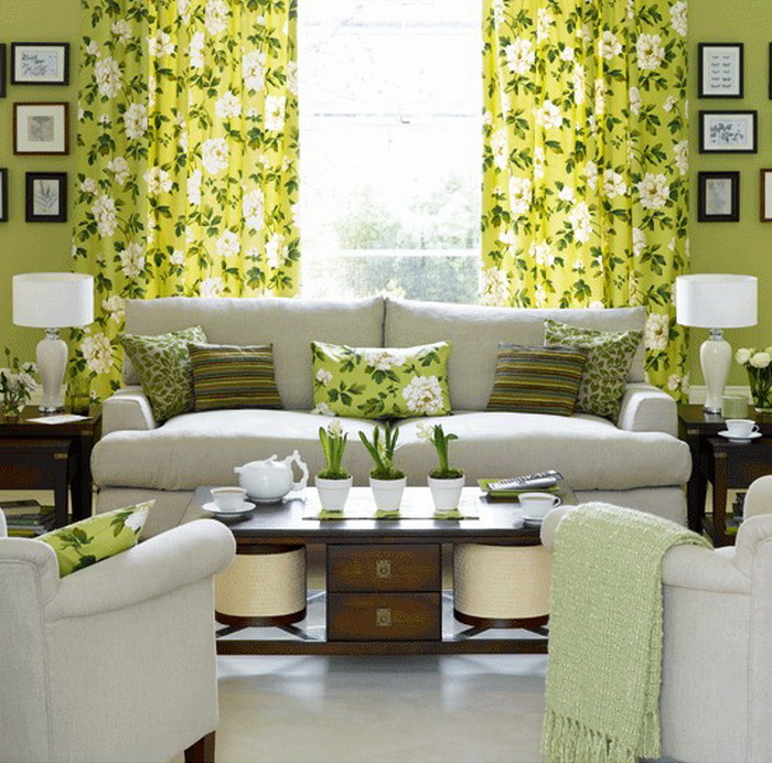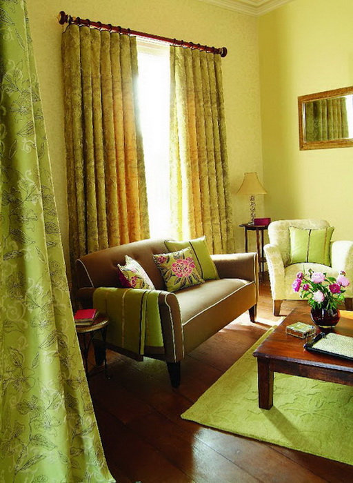 А вот комната с цветастыми шторами и белым диваном, кажется перенасыщенной цветом, зеленью – шторы мешают.