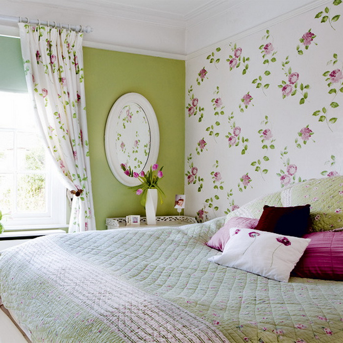 Очень нежно и трогательно выглядит комната с небольшими букетами на стенах. Всё дышит свежестью и покоем.