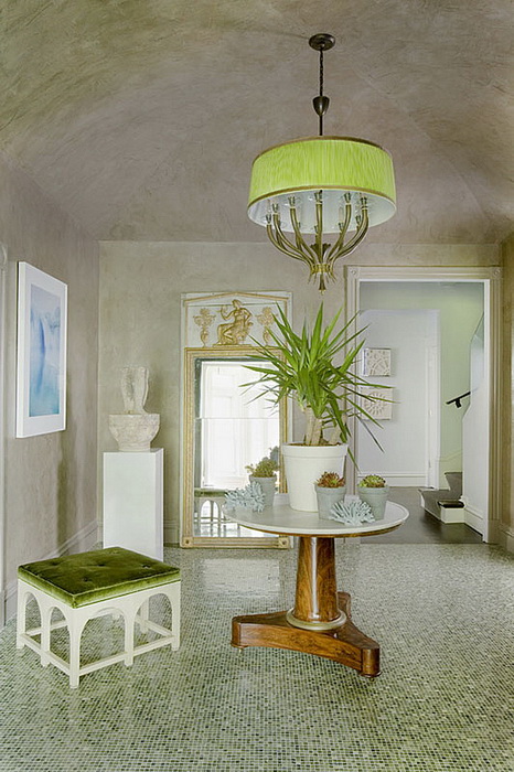 Обратим внимание, как детали делают «погоду» в доме. Милая мозаика на полу, банкетка и люстра из той же «оперы». Но оттенки совершенно разные. А вместе всё гармонично смотрится не даёт глазу разбежаться.