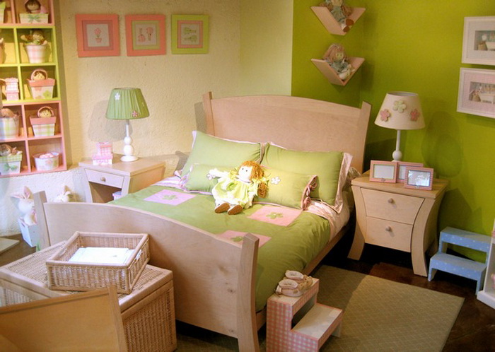 Совершенно по-иному воспринимается детская, где решили сложить теплый, почти розовый, цвет деревянных поверхностей и салатовый. Такой салатовый требует к себе совершенно другого отношения.