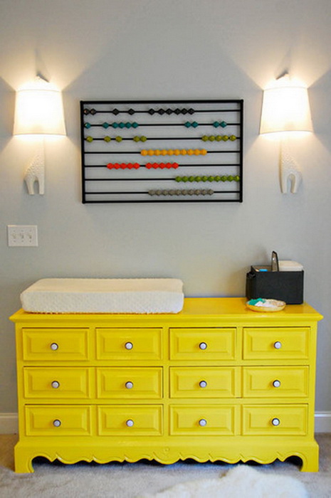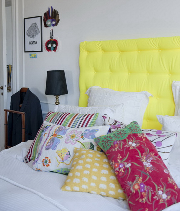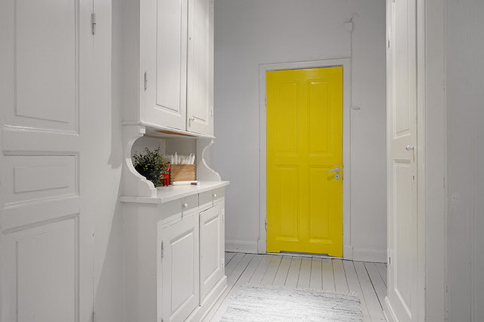 Жёлтый цвет в интерьере, словно лучи солнышка, неожиданно заглянувшие к нам в окно. Также звучит эта жёлтая дверь в этом, наверняка, «скандинавском» коридоре. Жёлтый цвет радует, дверь смешит тоже. А вот изголовье у кровати звучит очень даже по-королевски и жёлтый цвет этому помогает. На белой до стерильности кухне жёлтые нотки очень поднимают настроение и аппетит. Все, даже самые маленькие, вкрапления жёлтого цвета оживляют интерьер, делают его более радостным, интересным и солнечным.