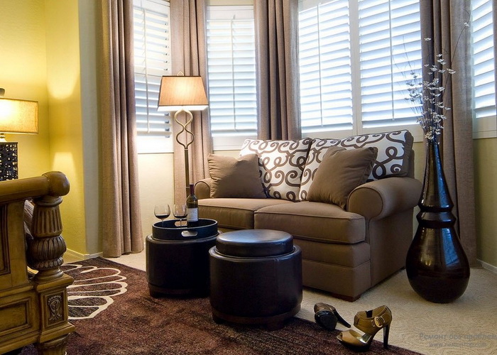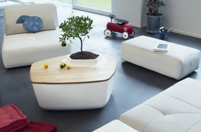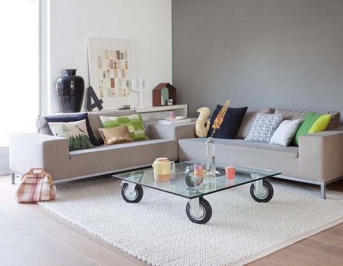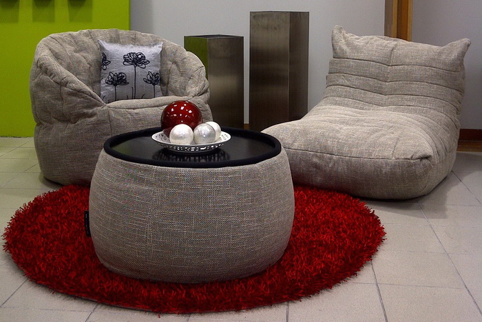 Молодёжь очень часто использует в качестве столиков мягкие пуфы. Ставит на пуф поднос с едой и удобный столик готов.