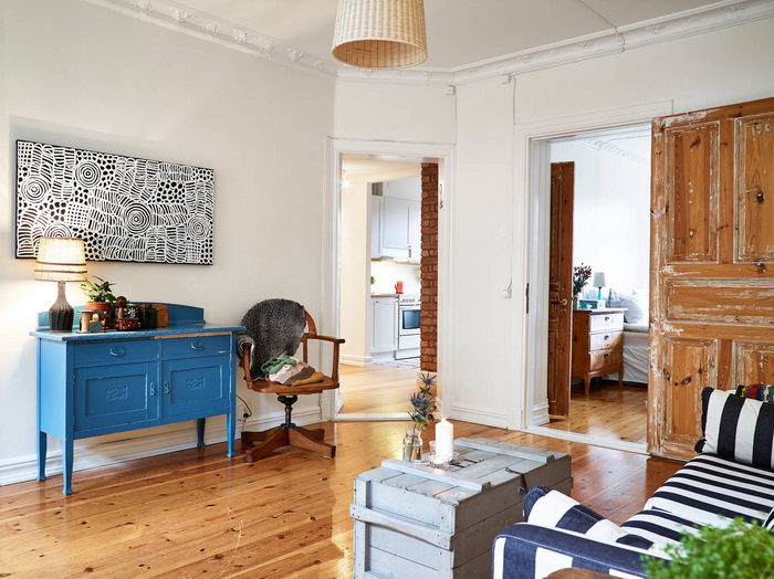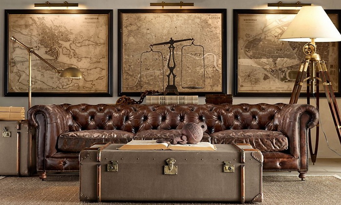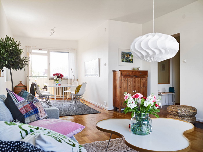 Просто и оригинально в современном интерьере смотрятся столики в винтажном стиле в духе 60-х. На 3-х тонких стройных ножках, со столешницей в форме овала. Если такой сохранился и стоит где-нибудь на даче, срочно реанимируйте его и на вид, в гостиную.