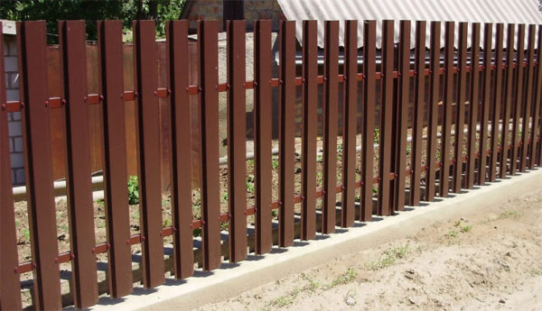 Металлический штакетник делают из листа оцинкованной стали. На листе формируется рельеф, после чего он нарезается на полосы-штакетины, покрывается защитными составами, красится. Получаются планки определенной высоты. Обычно высота — от 150 до 180 см. Для комплектации забора нужны еще опорные столбы (чаще всего 60*60*2 мм), тетивы (две или три поперечины, которые идут между столбами) и крепеж.