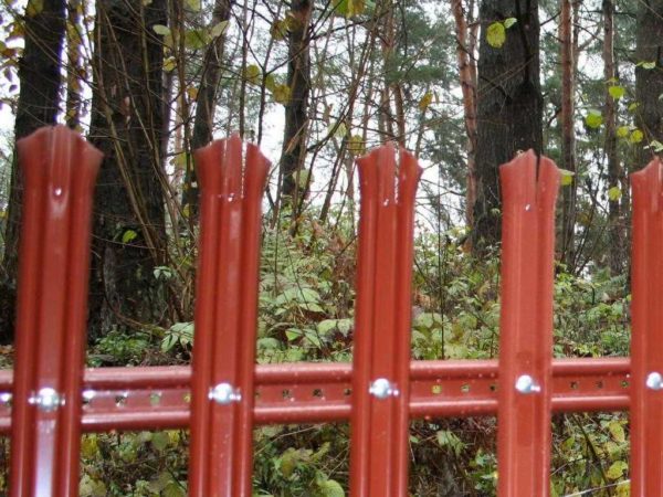 Так выглядит «изнанка» окрашенного с одной стороны забора из металлического штакетника