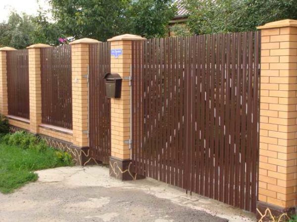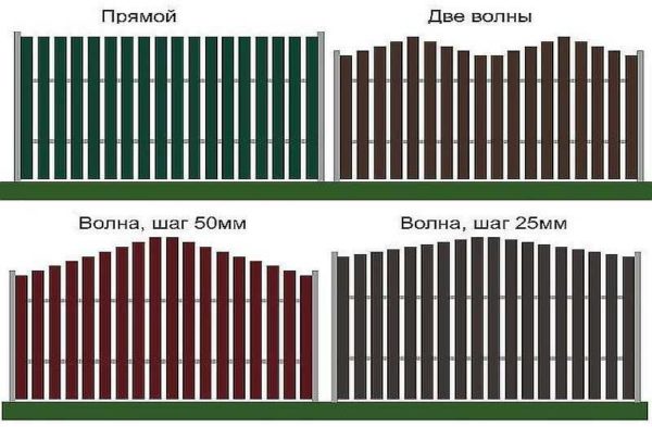 Есть еще несколько разновидностей заполнения пролетов (расстояния между опорными столбами). Проще всего в монтаже прямой способ — это когда все планки одной длины. Поверх такой ограды можно пустить П-образную планку из того же материала (продается там же где и евроштакетник). Кроме эстетической нагрузки, она еще прикрывает срезы металла, что увеличивает срок службы забора.