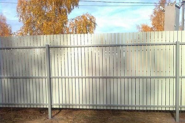 Ширина пролета вертикального забора из металлического штакетника — 200-250 см. Именно на таком расстоянии вкапывают столбы, затем между ними закрепляют две или три поперечины. Эти поперечины называют «лаги» или «тетивы». Для штакетника высотой до 150 см достаточно две поперечины, для более высоких лучше три.