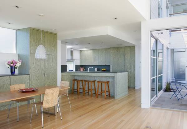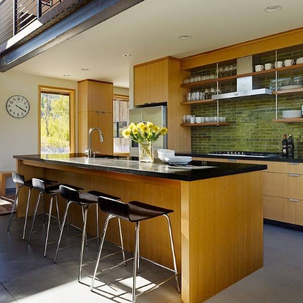 Зеленая кухня на последнем фото отличается шкафчиками с открытыми полками, что вполне соответствует 13 главным кухонным трендам 2015 года.