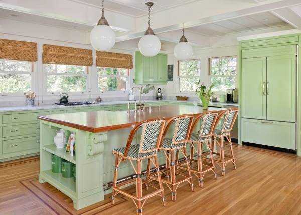 Более светлые и холодные оттенки зеленого, типа мяты и сельдерея, являются отличным вариантом для изысканного загородного стиля. Они легко придадут кухне свежую и прохладную атмосферу скандинавского дизайна.