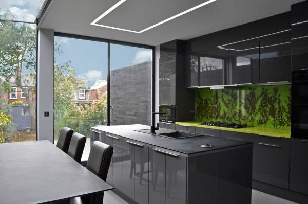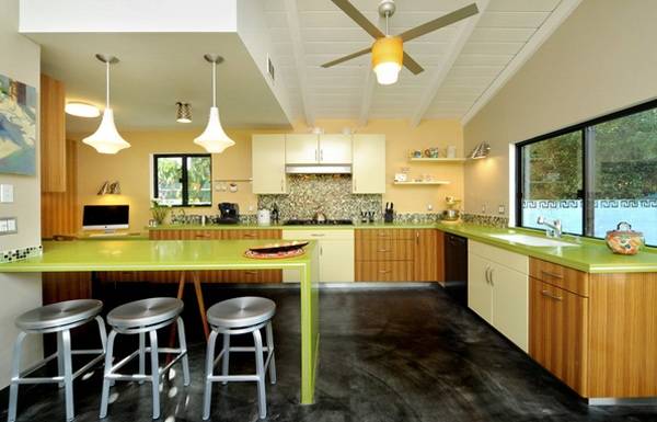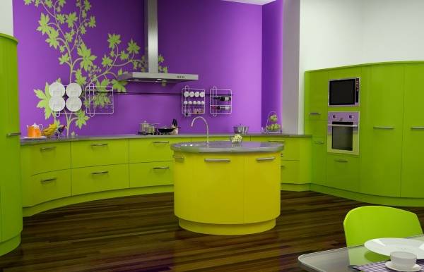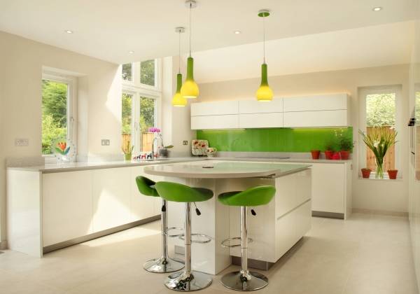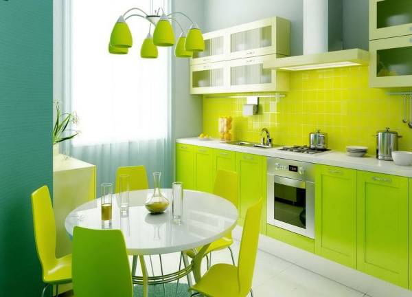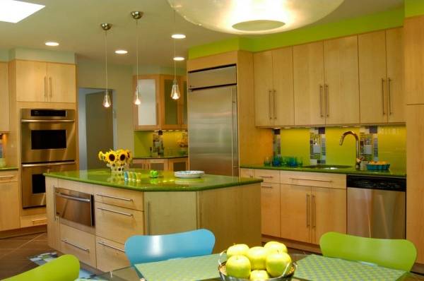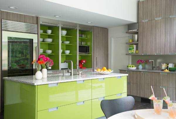 Яркие зеленые тона, типа лайма или яблока, создают в интерьере кухни ощущение современного стиля, жизнелюбия и бодрости. Прекрасно сочетаются с натуральными древесными оттенками для создания уюта, а также с белым и серым цветом — для элегантного и освежающего дизайна кухни.