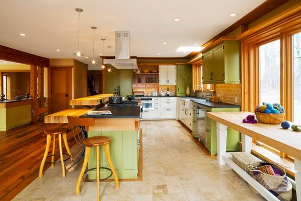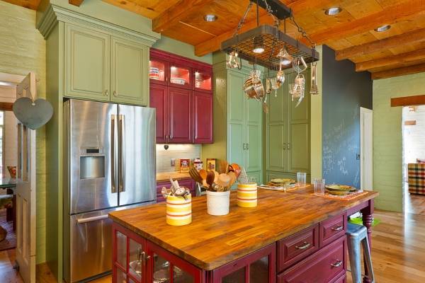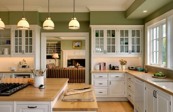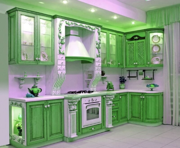 - Зеленые кухни в стилях прованс, минимализм, кантри и т. д.;