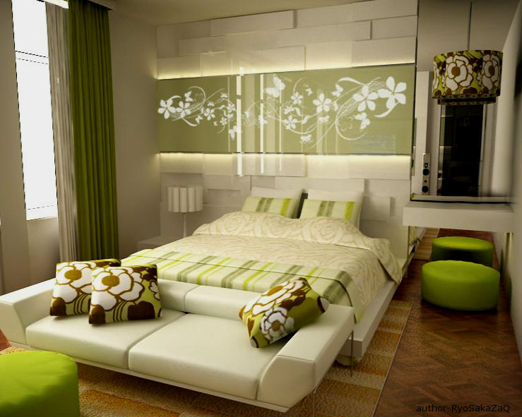 Зеленая спальня станет отличным решением, для людей плохо высыпающихся, тяжело встающих из теплой постели по утрам, да и в целом, для тех, кому нужен полноценный отдых. Многообразие зеленых оттенков может поставить в ступор, но не стоит переживать по этому поводу, в этой статье мы рассмотрим варианты правильного выбора цвета. Итак, если помещение малогабаритное, небольшое, да еще и с окнами, смотрящими на север, то свое предпочтение лучше отдавать сочным светлым оттенкам: фисташковому, оливковому, зеленому яблоку.