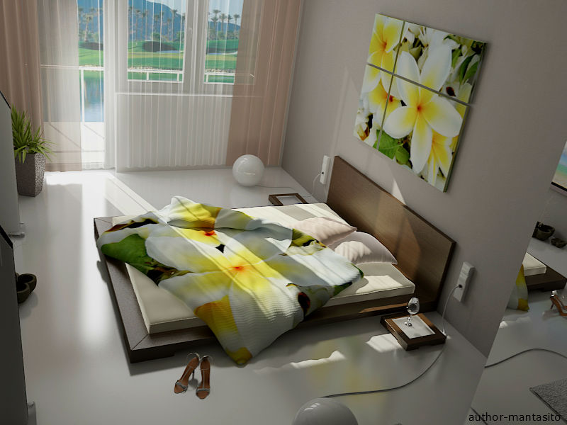 Такую спальню можно будет дополнить желтыми оттенками и тогда помещение станет по-настоящему светлым и жизнерадостным.