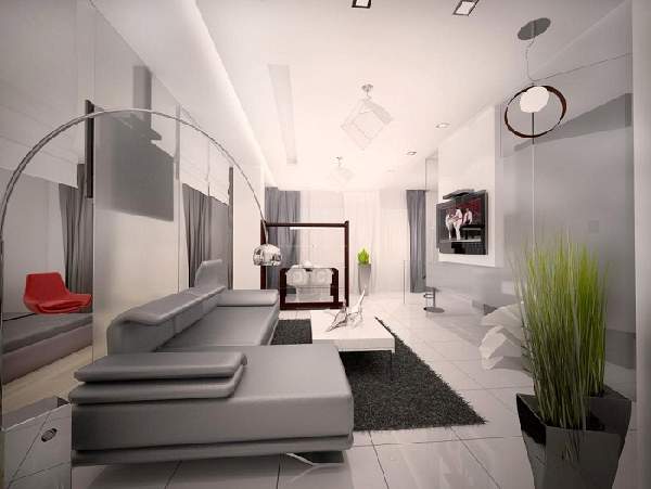 Минимализм, пропагандирующий строгость линий и наличие только полезных элементов интерьера, демонстрирует зонирование перегородкой, которая, в свою очередь, является телевизионной подставкой и мини-системой хранения прессы, мелких предметов быта.