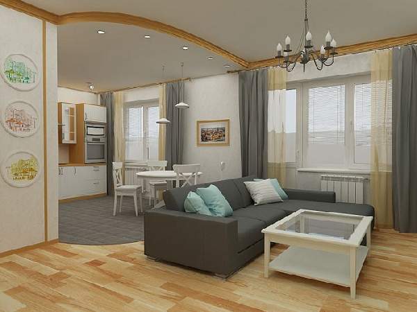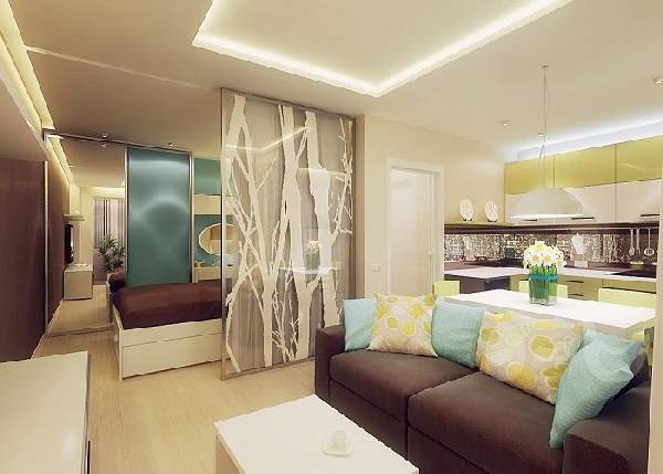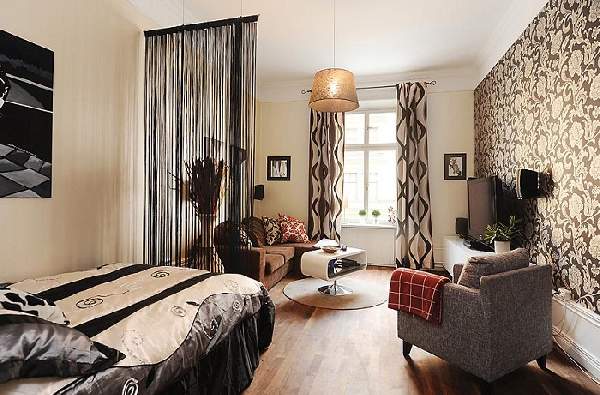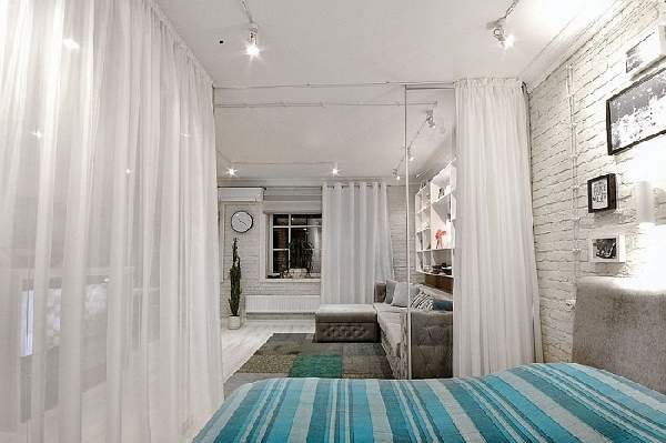 Если Вы решили оставить первозданную планировку или же наличие конструкций не допускает демонтаж, ознакомьтесь, как в данном случае организовано зонирование комнаты в однокомнатной квартире. Часто, перегородками (шторами) «маскируется» спальня, а на виду остается гостиная.