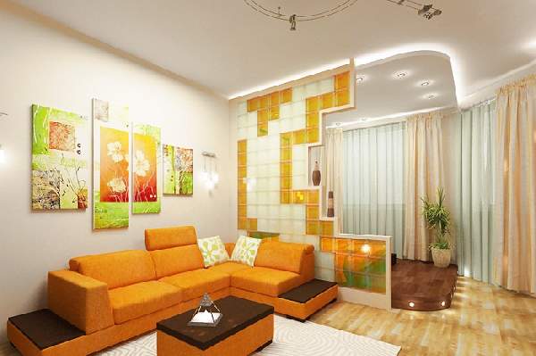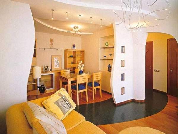 Наибольший зрительный эффект размежевания достигается перегородками разных конфигураций. Зонирование однокомнатной квартиры, как показывают фото, с установкой оригинальных гипсокартонных форм, помимо основной задачи, еще и значительно приукрасило интерьер. Для совсем крошечных площадей, стоит отдать предпочтение невысоким перегородкам стеллажного типа или вовсе установить стеклянные конструкции.