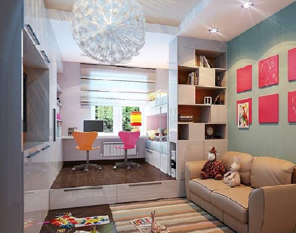 Уместно конструирование ступеньки-подиума. Особый плюс — наличие балкона. Присоединив его к комнате путем частичного сноса проема, и утеплив, предоставляется дополнительное пространство для установки письменного стола.