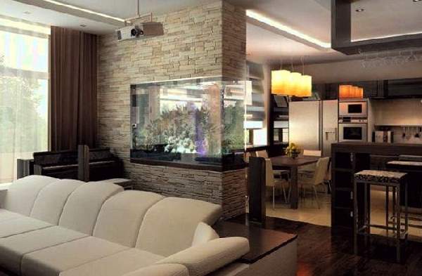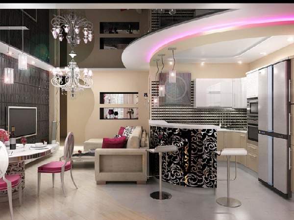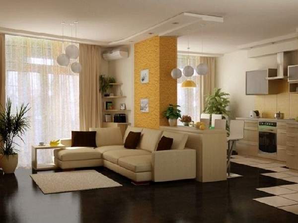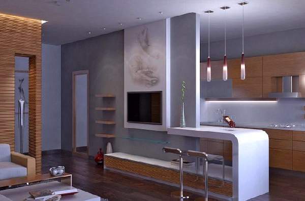 Полноценное освещение предполагает общие, а также местные осветительные приборы. Рассмотрим зонирование однокомнатной квартиры по фото. Над столешницей лучше разместить точечную систему с ярким светом, а обеденная территория может быть оснащена дополнительно люстрой. Возле дивана разместятся бра или торшер. Низкие подвесные светильники прекрасно дополнят барную стойку.