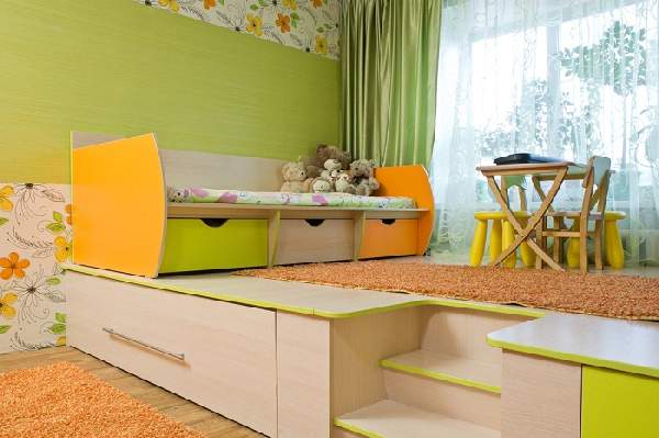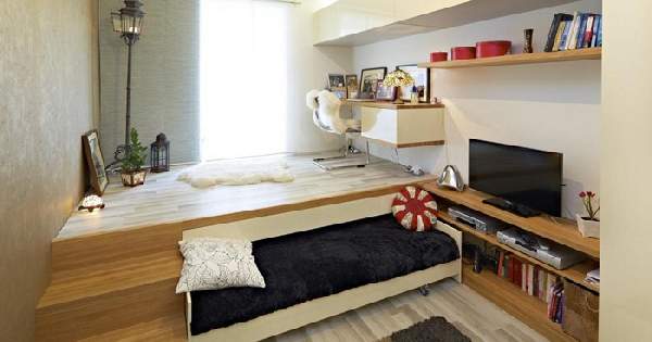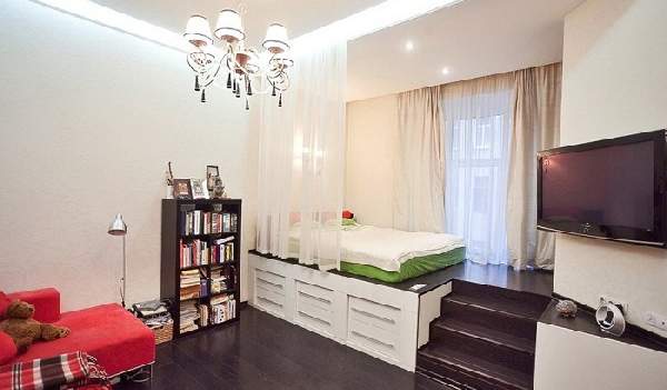 Ступенчатый подиум (модный в наши дни) создаст эффектное зонирование однокомнатной квартиры. Фото демонстрируют как невысокие его формы, так и более сложные. К примеру, обратите внимание на интерьер, где подиум имеет выдвижную кровать или множество ящиков, тумб для хранения разных принадлежностей. Маленький подиум, не превышающий 15 см, уместен в кухне-гостиной, выделяя рабочую зону, а большой (функциональный) лучше расположить у окна, разместив на нем компьютерный стол, диван или уголок ребенка.