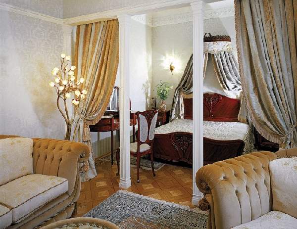 Классический дизайн показывает удачное зонирование изящными шторами, декоративными колоннами и обоями.