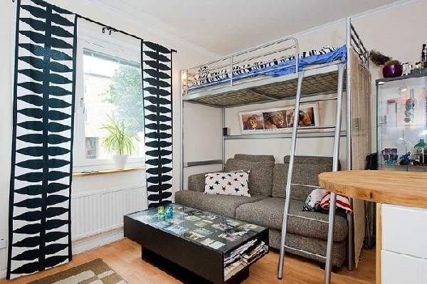 Крохотная площадь чаще всего вынуждает прибегнуть к организации квартиры-студии. Например, зонирование однокомнатной квартиры (фото лофтового интерьера) 18 кв м лучше произвести именно таким образом — избавиться от внутренних стен и использовать стеклянные отгораживающие конструкции. Прозрачность сделает интерьер просторным, светлым. Оформляя отдельные участки маленького помещения, часто применяют невысокие открытые стеллажи, устанавливая их перпендикулярно стенам. К тому же, на них можно хранить необходимые вещи (сувениры, книги и пр.). Если в планировке имеется кладовая — переоборудуйте ее в спальню или кухонную зону.