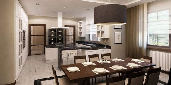 В стиле арт-деко индивидуальность территории с кухней подчеркнута роскошным потолочным оформлением.