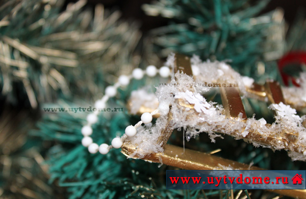 Приступаем к декору. Наносим в нужные места тонкий слоя канцелярского клея, и посыпаем искусственным снегом, покрошенным пенопластом и блестками. А также клеим мелкие снежинки из бумаги, созданные при помощи фигурного панча. Клеим к внутренней части санок на клей-момент веревочку или нить из мелких бусин.
