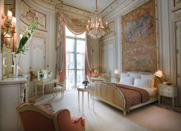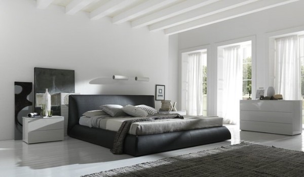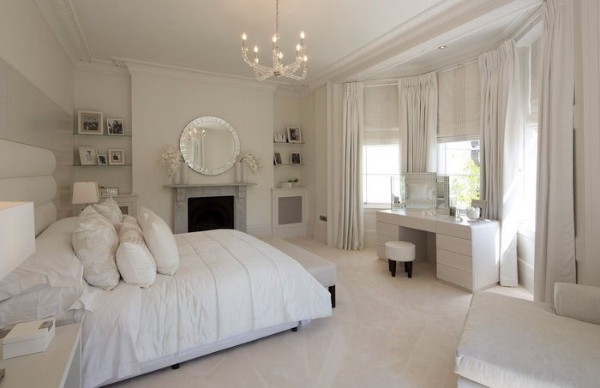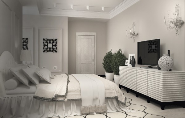 Центральное место здесь должно занимать спальное место. Можно расположить по обе стороны от него прикроватные тумбочки. Если пространство позволяет, выделите уголок для туалетного столика. Возможно, вы захотите поставить у одной из стен стол-консоль. У изножья обычно ставят мини-диван, банкетку или пуфик. В принципе, этого достаточно.