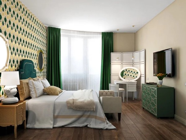Бирюзовый — это цвет моря, релакса, свежести. Он отлично вписывается в дизайн просторных спален. А в небольших интерьерах — «работает» на визуальное расширение.