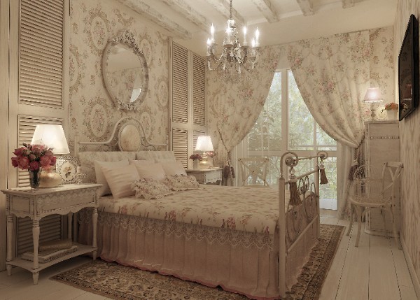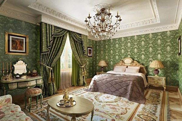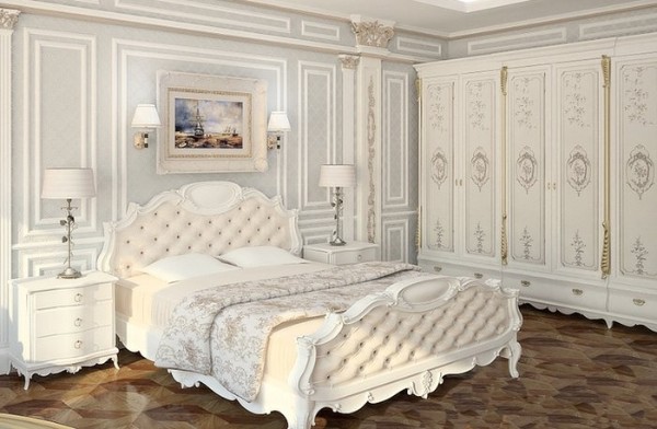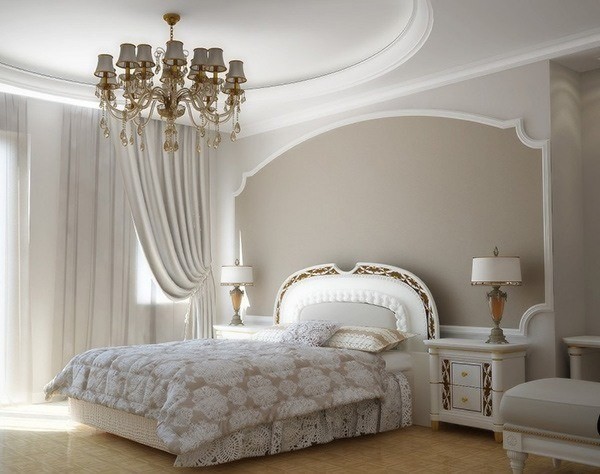 Потолок не стоит делать вычурным и ярким. Белый матовый — оптимальный вариант. В случае, если речь идет об изысканных интерьерных направлениях (барокко, французский стиль, классика) допускается использование молдингов, широких плинтусов, розеток. Хотите узнать больше о декоре спален — читайте эту статью.