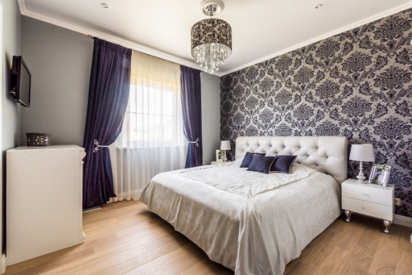 В небольшой спальне используйте фиолетовый фрагментами: в портьерах, подушках, принте на обоях. А вот насыщенную акцентную стену с таким цветом можно себе позволить только в просторной спальне. Иначе интерьер будет смотреться тяжело.