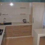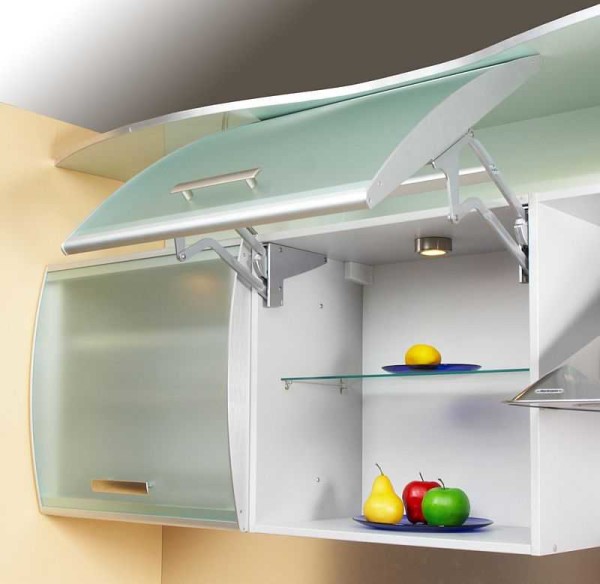 Чтобы сэкономить место, в мини-кухнях можно сделать шкафы, дверки которых открываются не в стороны, как мы привыкли, а отъезжают вверх. Такая фурнитура стоит довольно дорого, но экономит довольно много пространства.