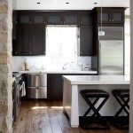 Если такой вариант вас не особо радует, можно подобрать цвет напольного покрытия в тон столешницы или отделки мебельного гарнитура. Вы же помните, что дизайн маленькой кухни предписывает использовать не более двух цветов. Так что выбор не особо велик: делать очень светлый пол или чуть темнее, но в одной гамме. Темный пол в тон столешницы вы видите на фото выше, а светлый — на фото ниже.