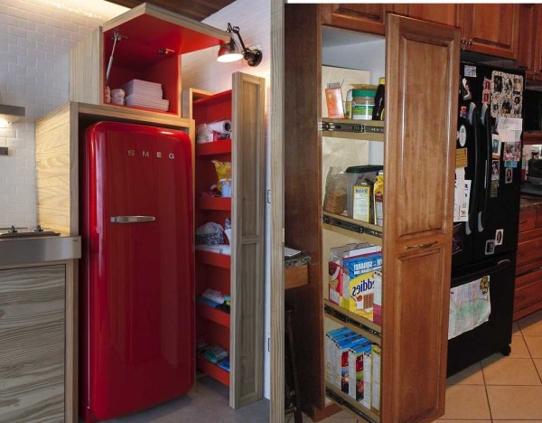 Использоваться должна любая даже самая незначительная площадь. Например, часто между холодильником и стеной остается расстояние около 10 см шириной. Ну, как его использовать? Сделать выдвижной шкафчик для специй или других мелочей.
