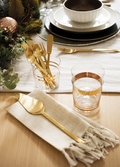 Посуду желательно подобрать в одном стиле, с элементами золотой росписи или полностью золотого цвета. В новогоднюю ночь это будет выглядеть шикарно – пламя свечей, отражаясь от глянца, внесет особую романтику в дом.