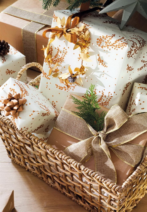 Под елку принято класть коробки с подарками. При золотом новогоднем дизайне интерьера уместно будет обернуть их в золотистую упаковочную бумагу или перевязать золотой лентой. Такой антураж ненавязчиво добавит в праздничное настроение игривости.