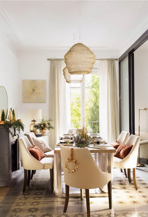 Текстиль такого цвета максимально уместен в декоре. Золотая скатерть на столе и салфетки в тон привлекут в новый год изобилие. Шторы на окнах и декоративные подушки на мягких диванах и креслах создадут атмосферу благополучия и помогут преобразить будничный дизайн интерьера в праздничный. Рождественские веночки на стульях, окнах и дверях – прекрасное праздничное интерьерное решение.