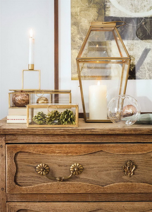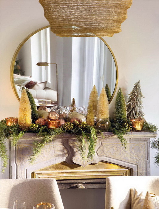 Если новогоднее убранство решено выдержать в золотом цвете, то привычные аксессуары в единой цветовой гамме придутся как никогда кстати. Это – вазы, настольные лампы, люстры, бра, фоторамки, зеркальные рамы, статуэтки, элементы мебели и многое другое. Важно такие предметы сделать гармоничной частью единой новогодней композиции, тогда они подчеркнут момент торжества.