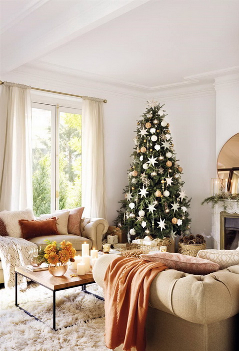 Традиционно, для создания рождественского интерьера, используется палитра зимнего леса. В этом случае чаще всего фоном служат белый и зеленый оттенки, а яркими вкраплениями врываются красный и золотой цвета.