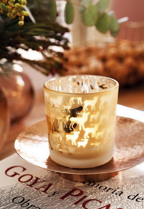 Чтобы внести торжественную ноту в новогодний дизайн интерьера достаточно приобрести несколько свечей и поставить их в позолоченные подсвечники, или купить свечи золотистого цвета. Несколько еловых веточек и шишек дополнят такую композицию.