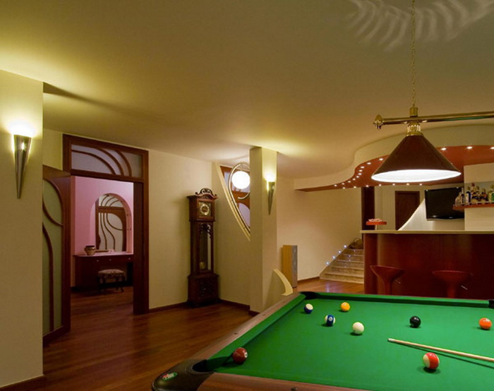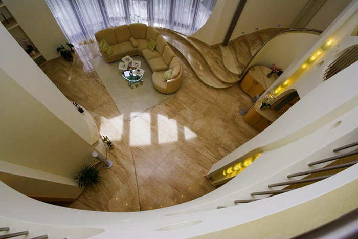 Извилистые линии, которые плавно перетекают друг в друга и объединяют элементы, которые было сложно даже представить себе в объединенном виде. Так в едином стиле оформлены перила, элементы поддерживающих крышу опор и светильники: с использованием металлических труб, согнутых под идеально выверенными углами так, что создается ощущение, что перед нами совсем не металлические конструкции, а гибкие или даже текучие серебристые ленты или стебли стальных растений.