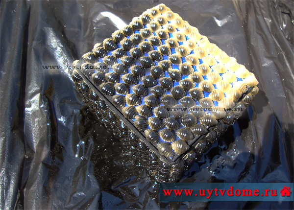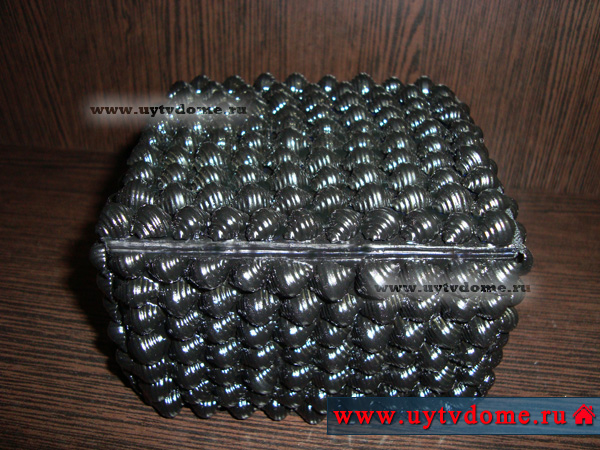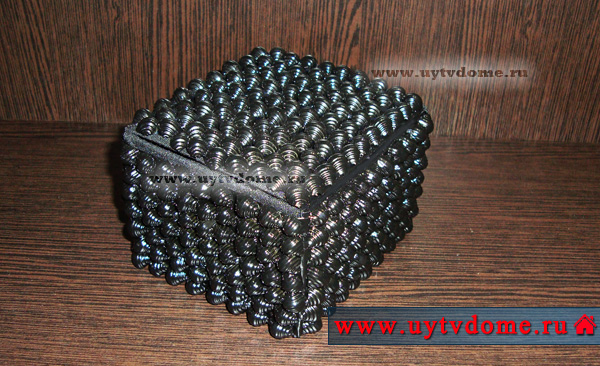 ► Внутри клеим подкладку – черную ткань. Можете смело выводить ткань на внешние стенки шкатулки, после приклеивания макарон, а также после покраски изделия ткань абсолютно не будет видна.